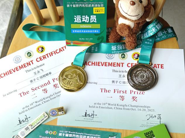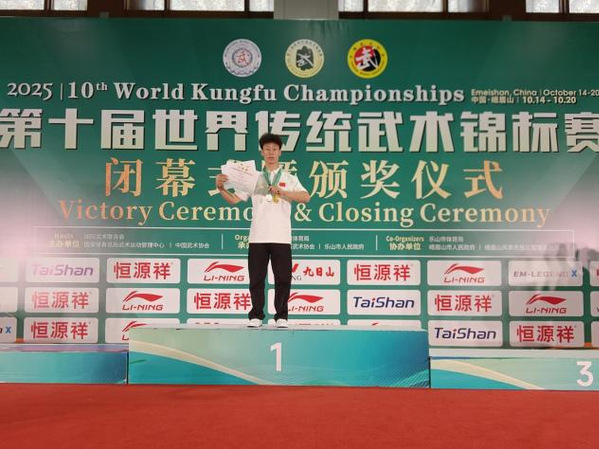 近日,备受瞩目的第十届世界传统武术锦标赛在四川省峨眉山落下帷幕。在2025年10月14日至20日为期七天的激烈角逐中,我校社会体育学院23级学子王永飞凭借精湛的武艺、沉稳的发挥和深厚的功底,从众多运动员中脱颖而出,最终荣获棍术一等奖与拳术二等奖的骄人成绩。